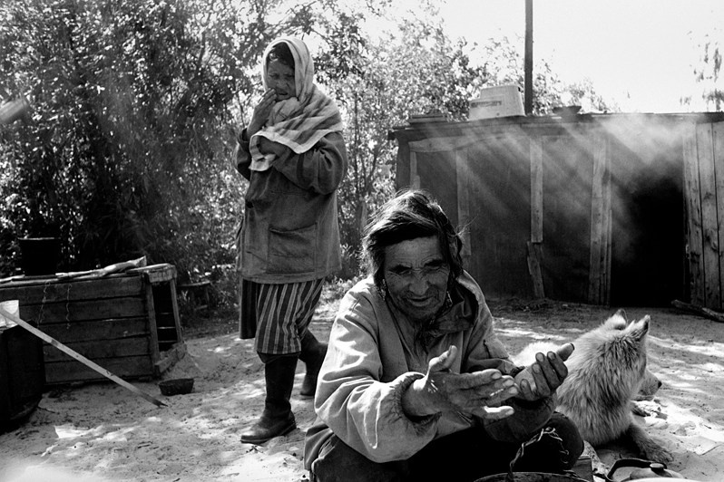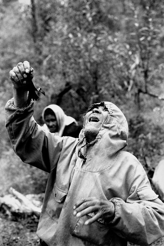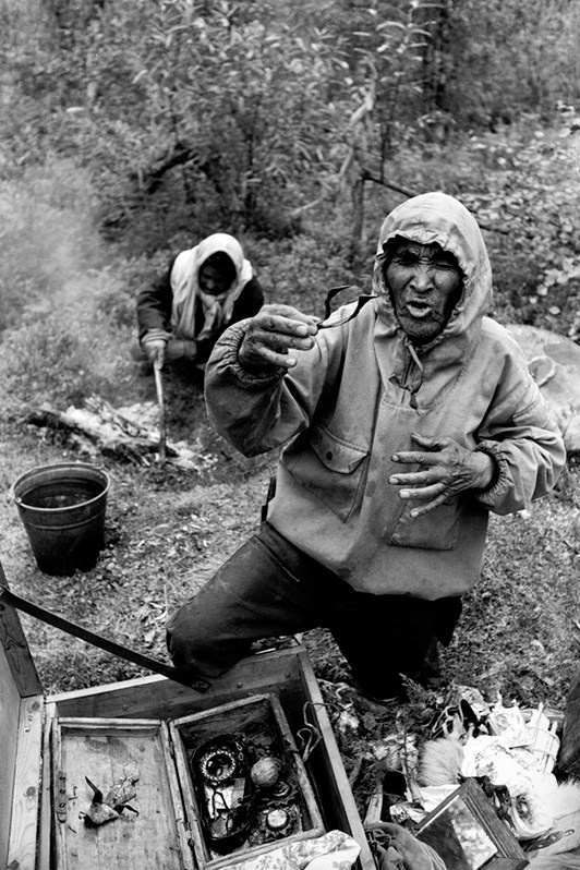 While posing for me, he was beating a huge tambourine and, raising his eyes to the sky, whispered something in the incomprehensible Selkup language to his spirits, shaking his shaman's trident. Through the slits of the eyes of a red fox skin, which was clad on the shaman's head, the blackness looked at me, and its tail moved in the wind as if it were alive.