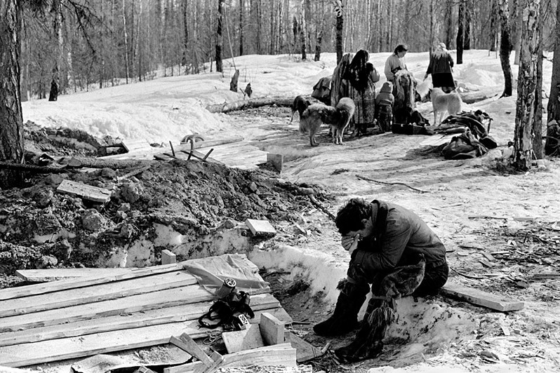 We landed near Brigade 1's car park, which was in a marshy area. It seemed that I found myself in another civilisation. People dressed in animal skins (malitsy) on one style of grey colour, island-topped plagues, dull tundra, and as for evil ‘there was a big mosquito’. The helicopter on which we arrived belonged to the sanitary aviation and made a special flight. Outwardly everything looked decent: the medics were dressed in white coats and behaved culturally, but the medical examination procedure was so fast that I did not have time to film it. In general, in Moscow doctors also do not treat patients with excessive attention and care, but here the process was going at record speed. People in white coats entered the tent, stepped over the dogs, asking on the way: ‘Will it bite?’, looked into the children's mouths, put packages of pills in the hands of women, politely greeted the men and went outside — that's it, this family had already joined the ‘free medical service’. Symbolically, ten days after this examination, an 11-year-old girl died in the brigade and was buried there in the tundra. I am not going to judge anyone, God forbid, the medics know the local conditions better, they have a hard job, they live there, after all, but I feel sorry for their patients.
